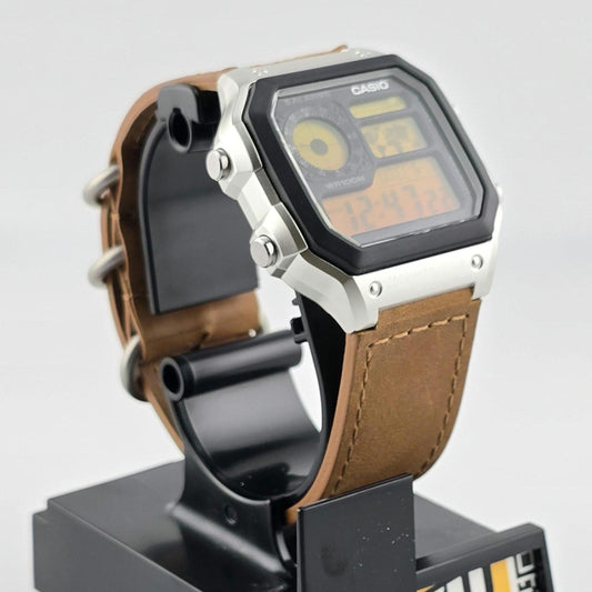 Casio AE-1200 Modified. Color Filtered LCD Watch on Brown Leather Strap