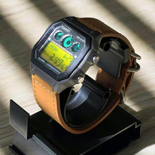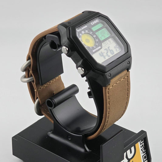 Casio AE-1200 Modified (Black). Color Filtered LCD Watch on Brown Leather Strap