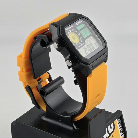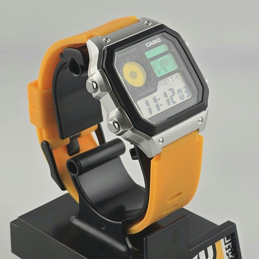 Casio AE-1200 Modified (Black). Color Filtered LCD Watch on Orange Sports Silicon Strap