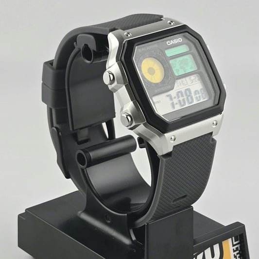 Casio AE-1200 Modified (Black). Color Filtered LCD Watch on Grey Sports Silicon Strap